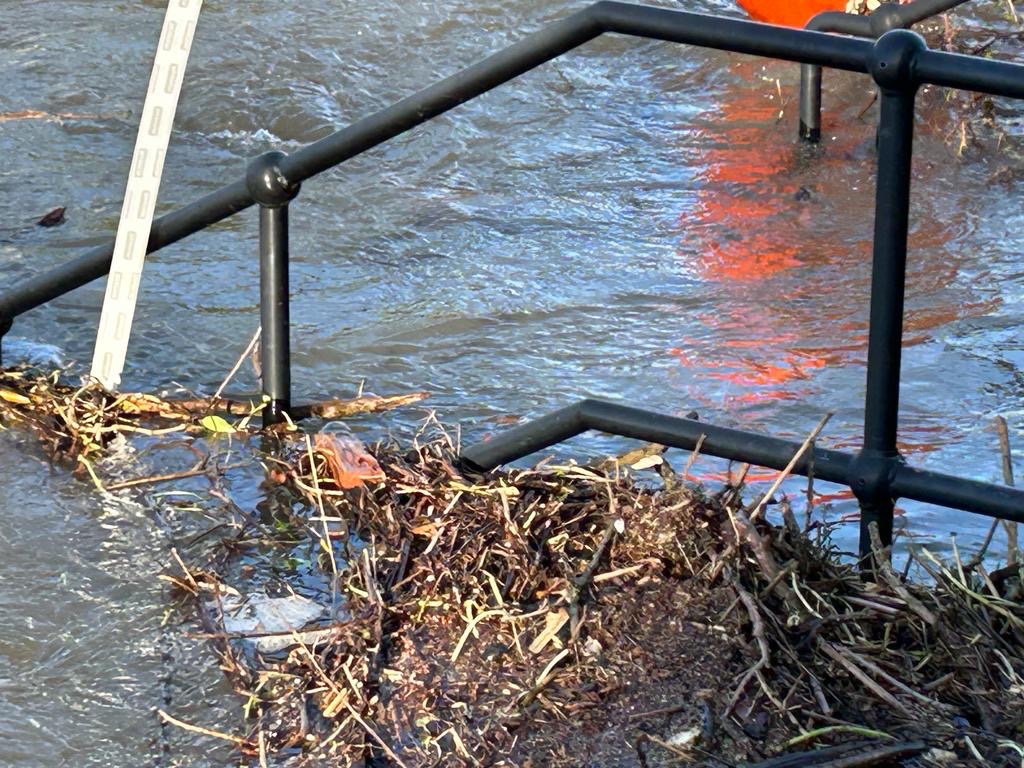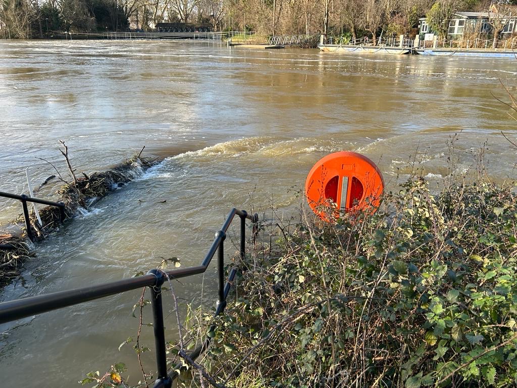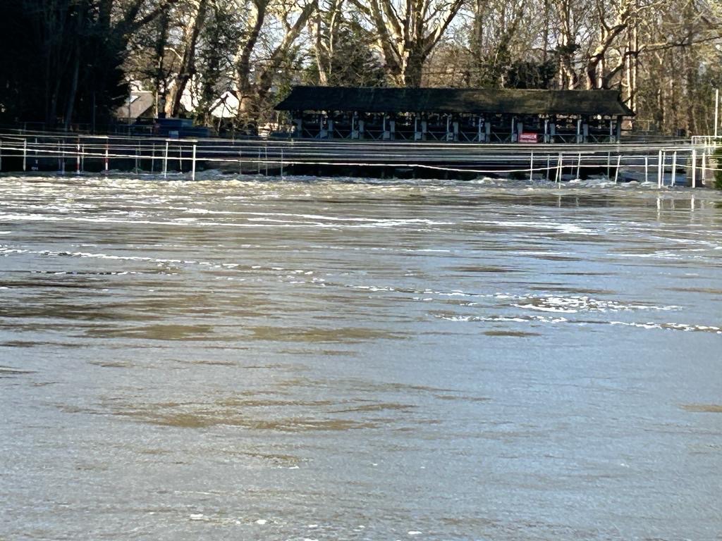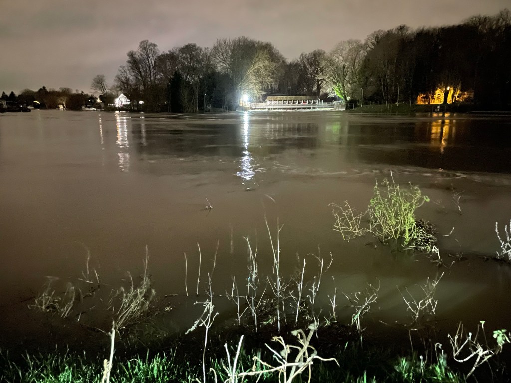 Steps down to the ferry Some flotsamThe water level is the same both sides of the weirThe green pontoon is attached to the bankGardens disappearing in Shepperton Looking over towards Shepperton D’Oly Carte island is disappearing Tow path and steps down to the river completely submerged Looking up the Thames cut and the river WeyThe weir at Shepperton at nightRiver bank completely submerged. River about 4’ higher than normal