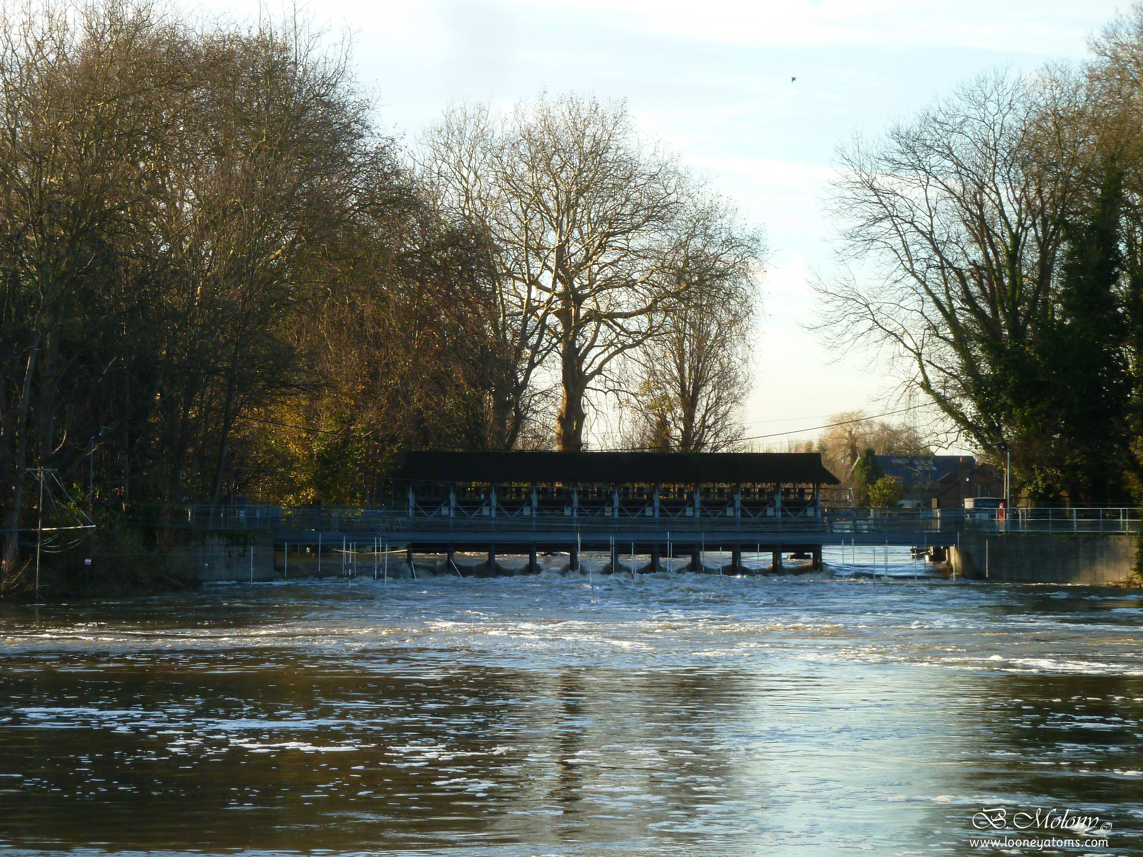 Weybridge Weir, water levels almost equal both sides of the weir