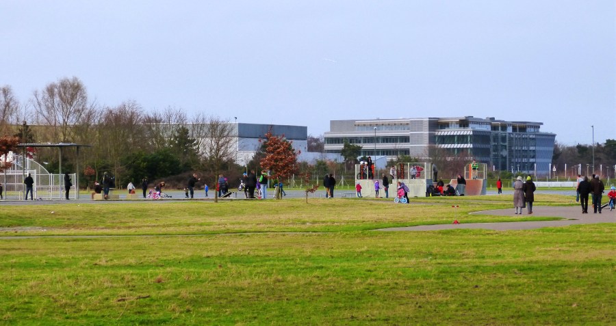 Families enjoying the race track with Christmas bikes, scooters and remote control cars
