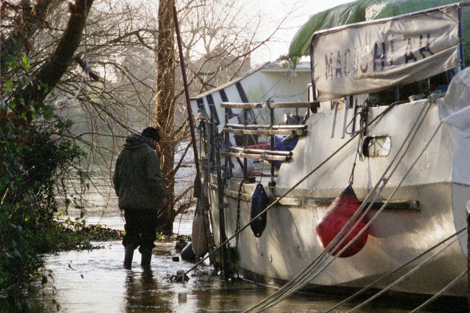 Trying to keep the boat from floating up onto the bank, Port Hampton