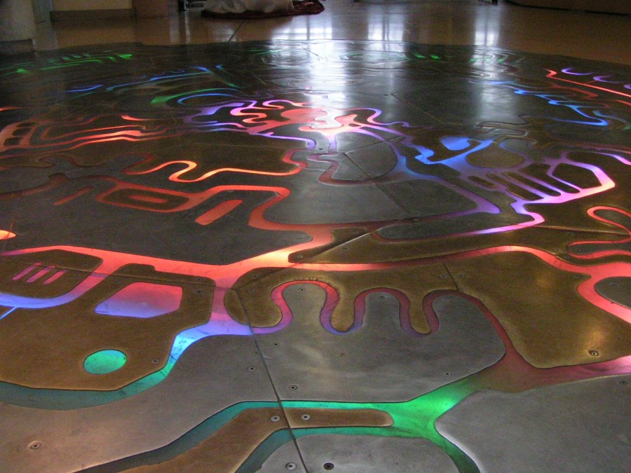 The floor of the Visitor Centre in CERN. The floor lights up in different places in response to the detection of cosmic rays